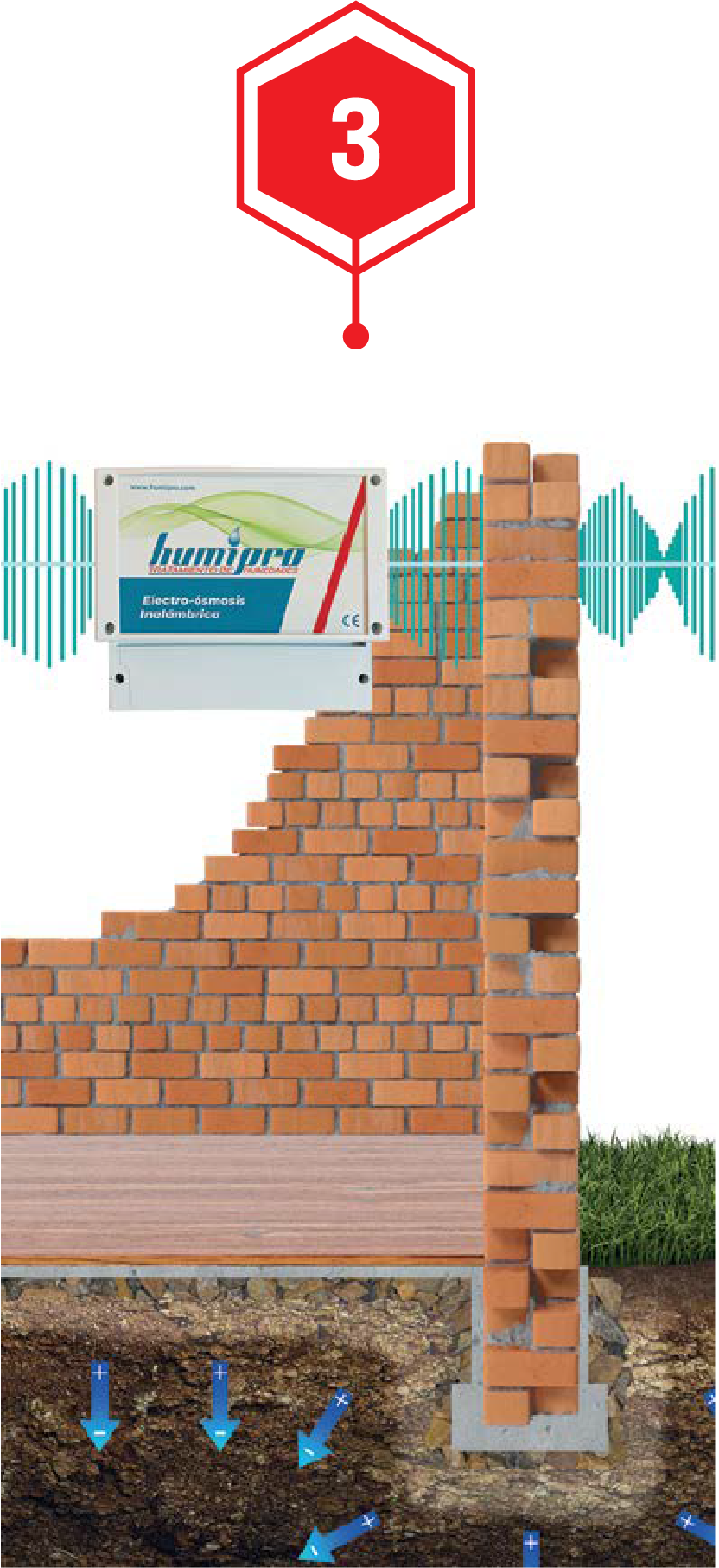Durch niederfrequente Ultraschall-Wellen werden die elektrischen Pole innerhalb der Wasserpartikel invertiert. Dadurch verlieren die Moleküle ihre Haftung an den Baustoffen – das Wasser wandert durch die Schwerkraft wieder in den Boden zurück.